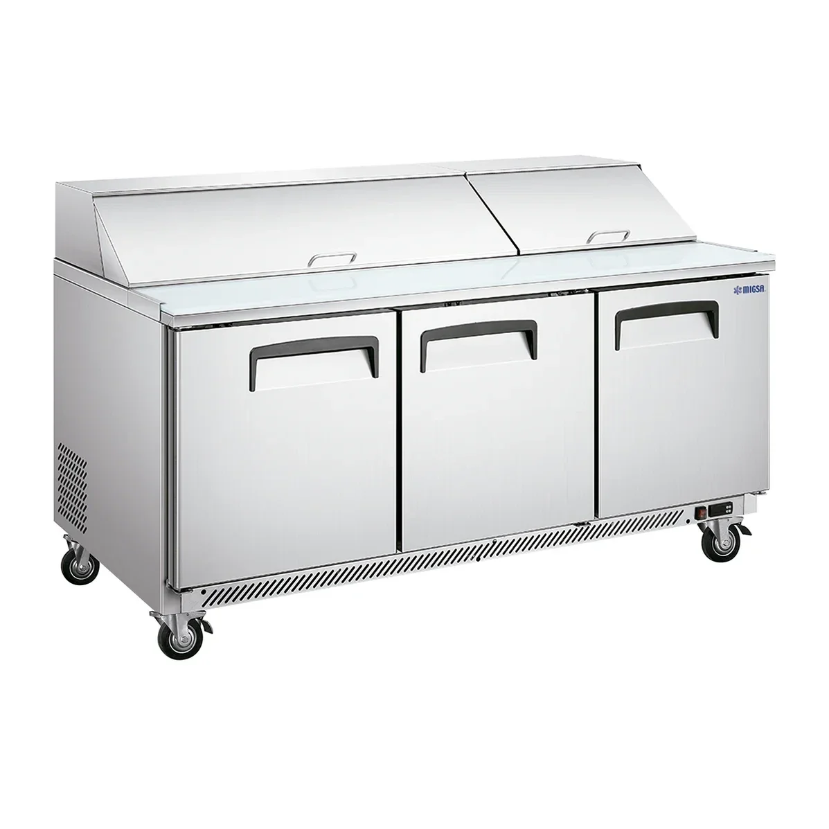 - Sección alta con tapa abatible y mesa de trabajo a todo el frente para preparación.