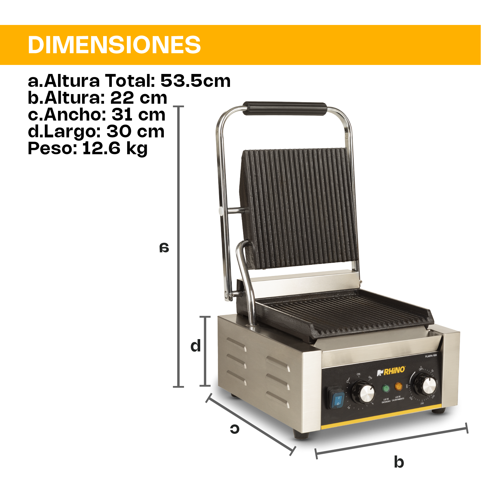 - Medidas: Frente 30.5 cm, Fondo 31 cm, Alto 19 cm, Alto total 52 cm, área de la plancha 20.5 cm x 21.5 cm
